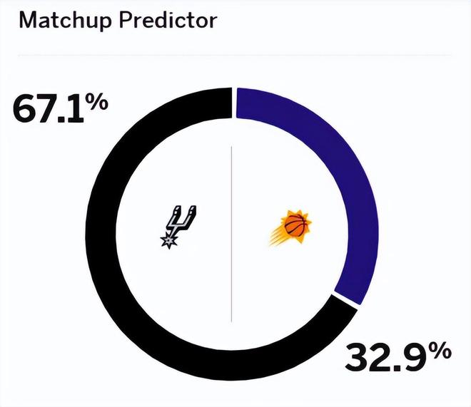 作为对比,太阳队在休赛期送走杜兰特、买断比尔之后,球队纸面实力以及竞争力纷纷下滑,目前仅以2胜4负的战绩排名西部第12位,可以摆烂去争乐透签了。赛前,美媒ESPN对本场比赛的胜率进行了预测,马刺胜率为67.1优势明显,太阳胜率则仅为32.9%。