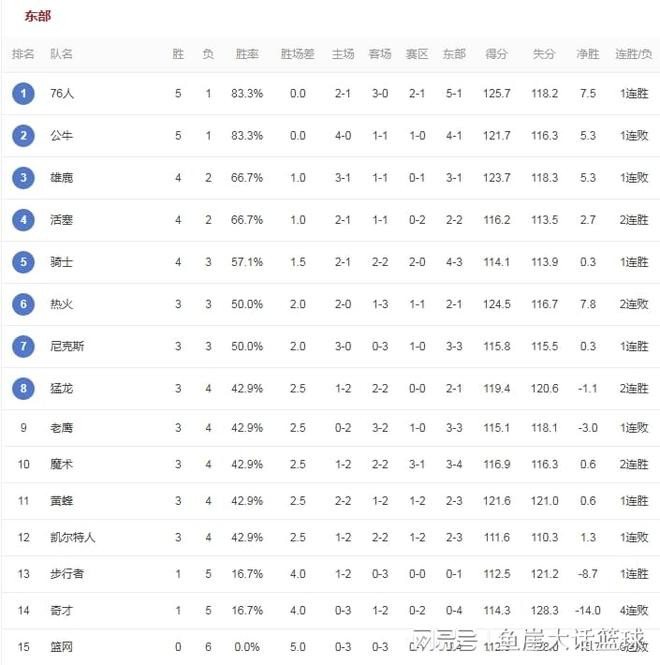 76人在今天的比赛中对阵篮网,这场比赛76人虽然是缺少了恩比德,但是马克西在场上有着稳定的发挥不说,同时这场比赛中76人探花埃奇库姆和格莱姆斯也有着不错的表现,加上乌布雷也一度在比赛中打出爆发表现,因此这场比赛的悬念也没有持续太久,最终76人大胜篮网。而在这场比赛后76人更是以5胜1负的战绩升到了东部第一的位置,篮网则遭遇6连败排在东部倒数第一的位置,同时篮网也是东部这边唯一 一支未尝一胜的球队。同时在今天的比赛中老鹰对阵骑士,本场比赛骑士虽然一度拉开比分,但是老鹰打得坚韧追上比分,但最终在米切尔带领下,骑士还是有惊无险的赢下比赛胜利。