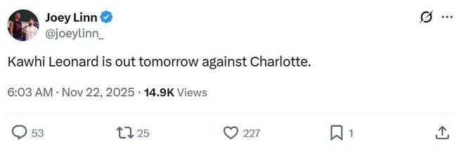 根据官方伤病报告显示,遭遇脚踝和脚扭伤的莱昂纳德将缺席快船对阵黄蜂的比赛,这将是其因伤连续缺席的第10场比赛。