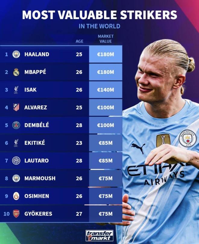 哈兰德、姆巴佩并列“身价最贵”基本无争议。哈兰德过去两季持续顶级产能与稳定健康,英超与欧冠双线都有硬数据作背书;姆巴佩转会皇马后市场热度、商业拉力与即战力叠加,1.8亿的锚点仍能解释。阿尔瓦雷斯的“1亿区间”也合理:能打9号/二前锋/边锋,压迫、衔接与无球跑动为强队体系增值,身价不仅是进球数。